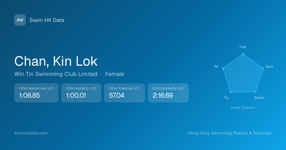 | 100m Freestyle | 57.04 2019-10-15 | 5 | 25 | 2019-10-15 |
