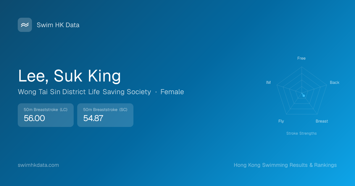 | 50m Breaststroke | 56.00 2019-12-06 | 3 | 43 | 2019-12-06 |