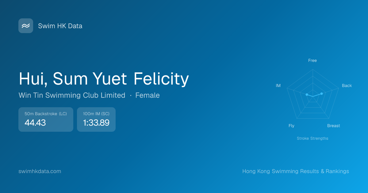 | 50m Backstroke | 44.43 2015-08-07 | 17 | 11 | 2015-08-07 |