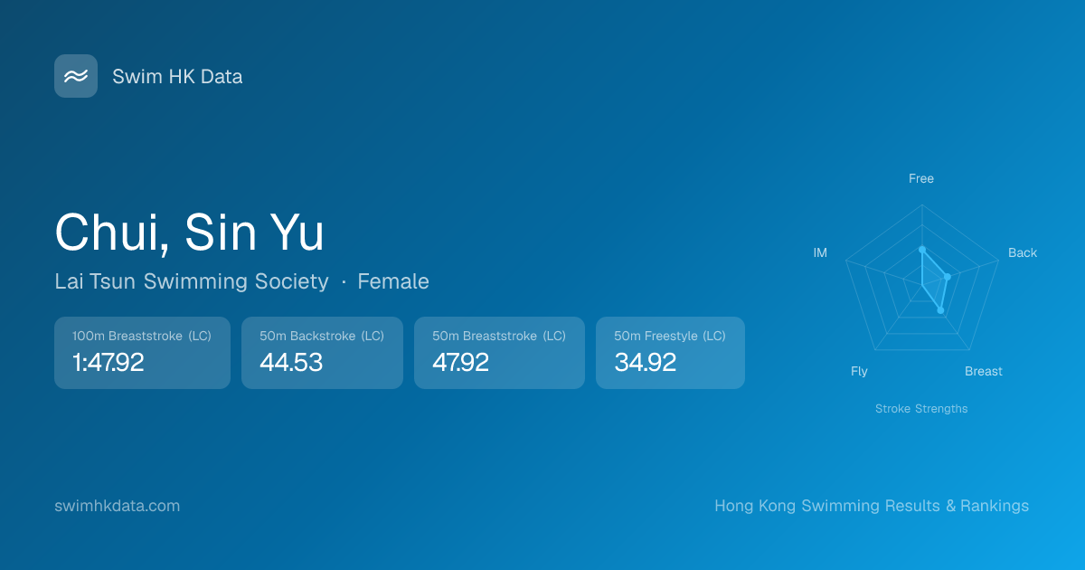 | 50m Breaststroke | 47.92 2018-07-05 | 21 | 11 | 2018-07-05 |