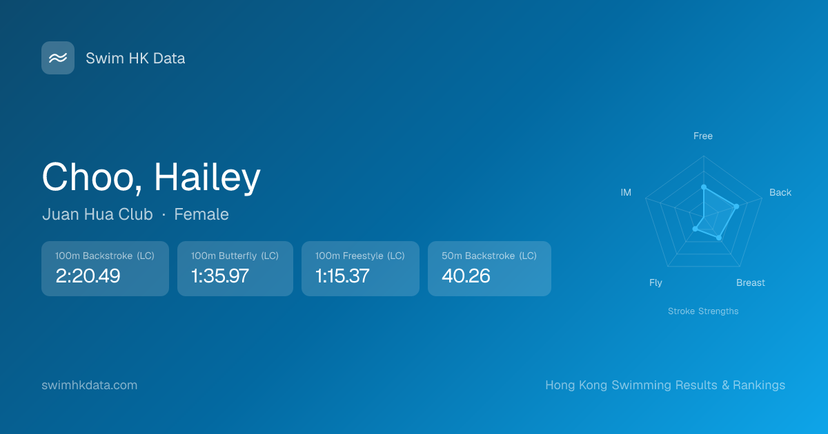 | 100m Backstroke | 2:20.49 2019-09-30 | 26 | 8 | 2019-09-30 |