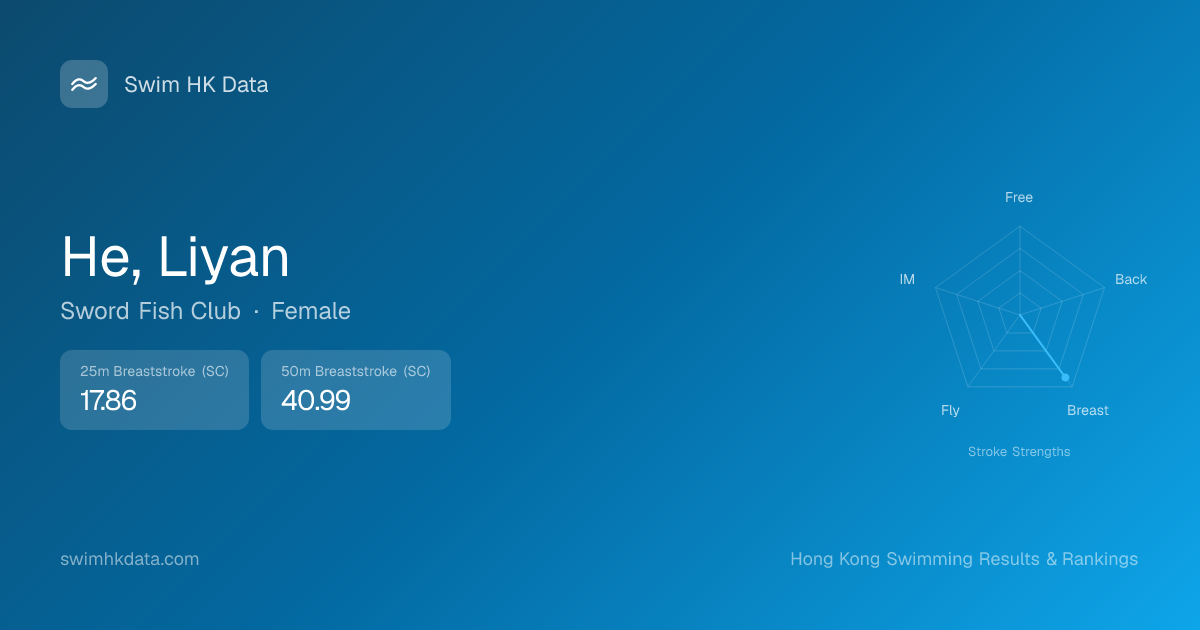 | 25m Breaststroke | 17.86 2023-09-18 | 6 | 28 | 2023-09-18 |
