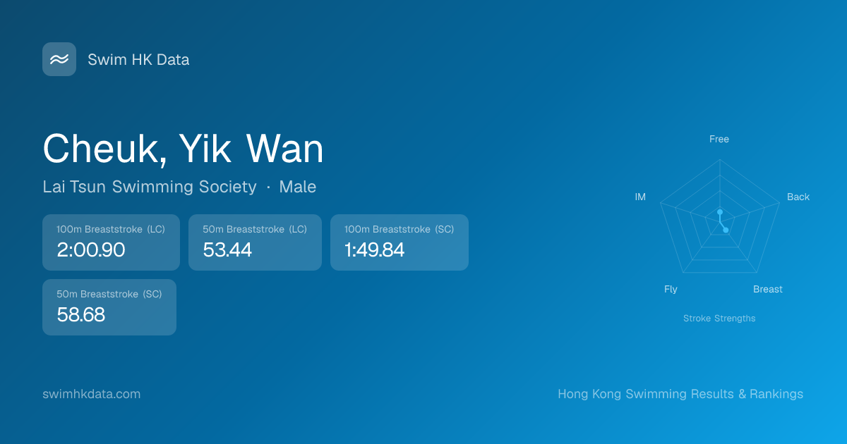 | 100m Breaststroke | 1:49.84 2026-03-04 | 88 | 10 | 2026-03-04 |