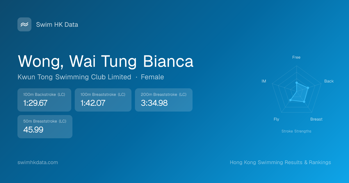 | 200m Breaststroke | 3:34.98 2025-08-27 | 63 | 12 | 2025-08-27 |