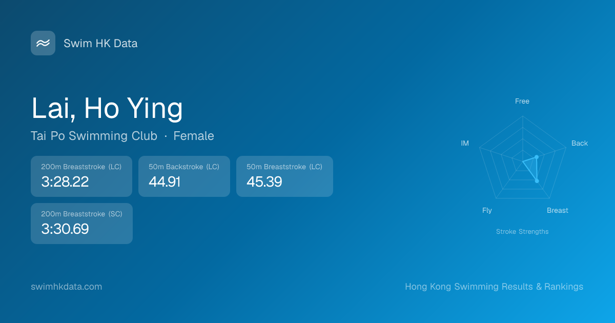 | 200m Breaststroke | 3:30.69 2026-03-16 | 62 | 12 | 2026-03-16 |