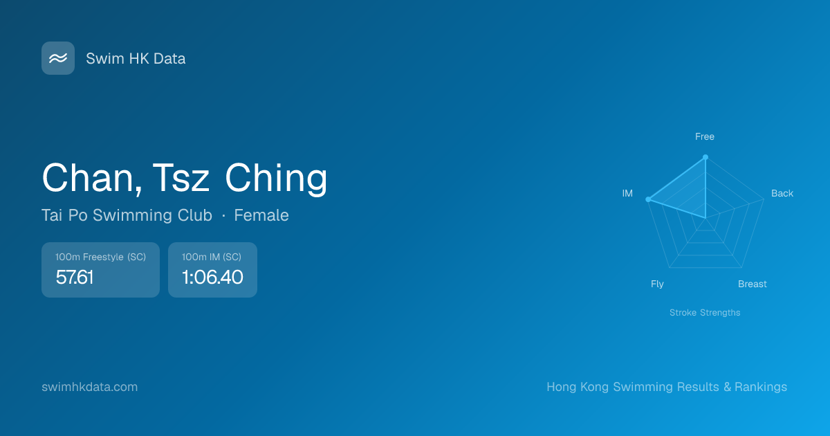 | 100m Freestyle | 57.61 2026-02-10 | 5 | 25 | 2026-02-10 |