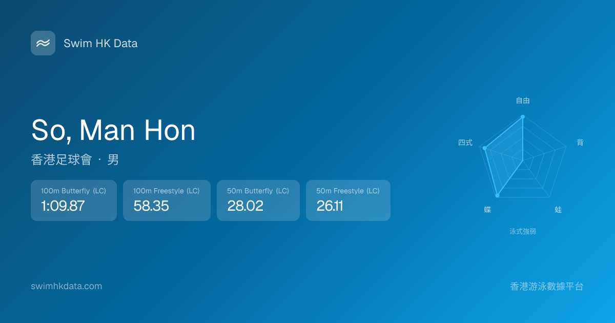 此圖表根據你所有比賽成績計算,顯示你在各泳式的相對強弱,僅供參考。繼續努力,每一次練習都會讓你更快更強!💪