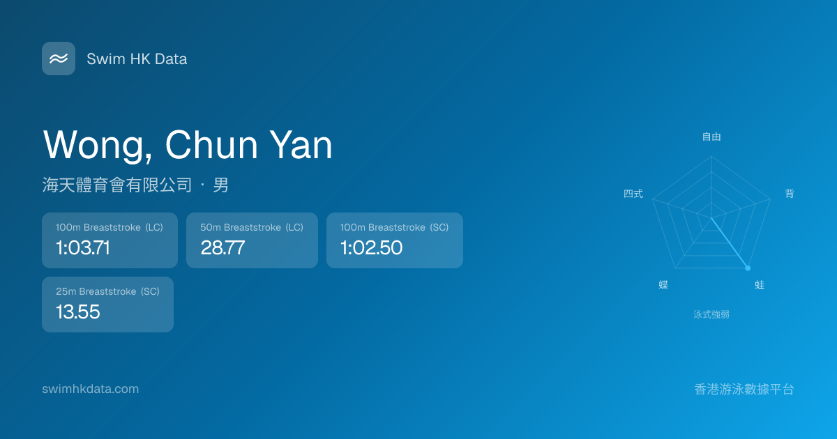 此圖表根據你所有比賽成績計算,顯示你在各泳式的相對強弱,僅供參考。繼續努力,每一次練習都會讓你更快更強!💪
