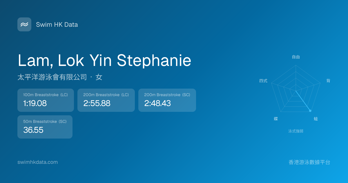 此圖表根據你所有比賽成績計算,顯示你在各泳式的相對強弱,僅供參考。繼續努力,每一次練習都會讓你更快更強!💪