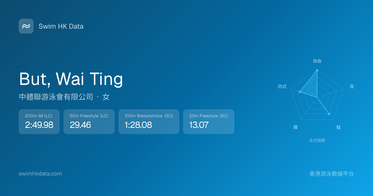 此圖表根據你所有比賽成績計算,顯示你在各泳式的相對強弱,僅供參考。繼續努力,每一次練習都會讓你更快更強!💪