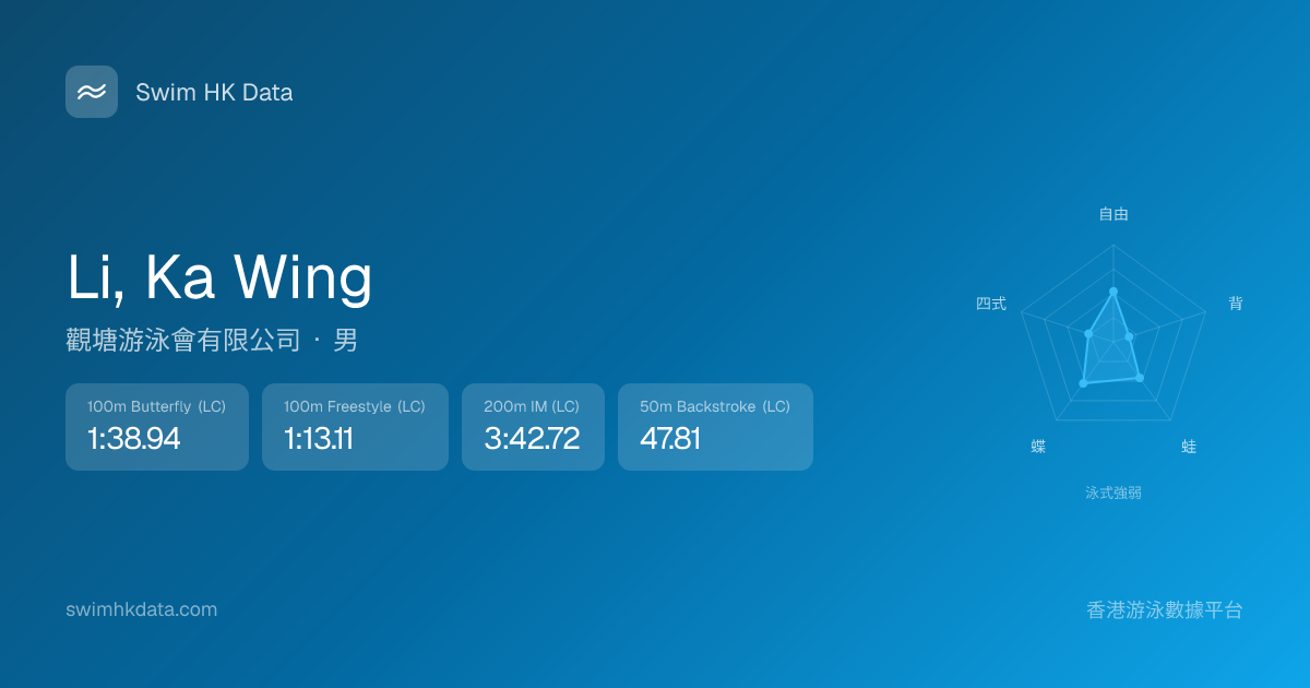此圖表根據你所有比賽成績計算,顯示你在各泳式的相對強弱,僅供參考。繼續努力,每一次練習都會讓你更快更強!💪