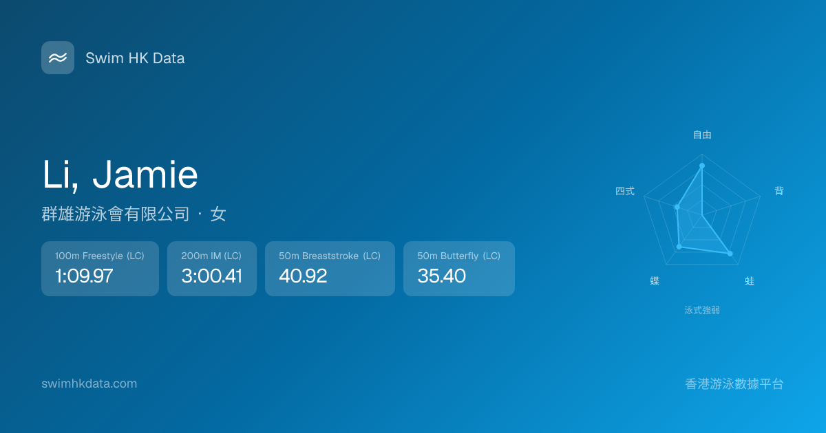 此圖表根據你所有比賽成績計算,顯示你在各泳式的相對強弱,僅供參考。繼續努力,每一次練習都會讓你更快更強!💪