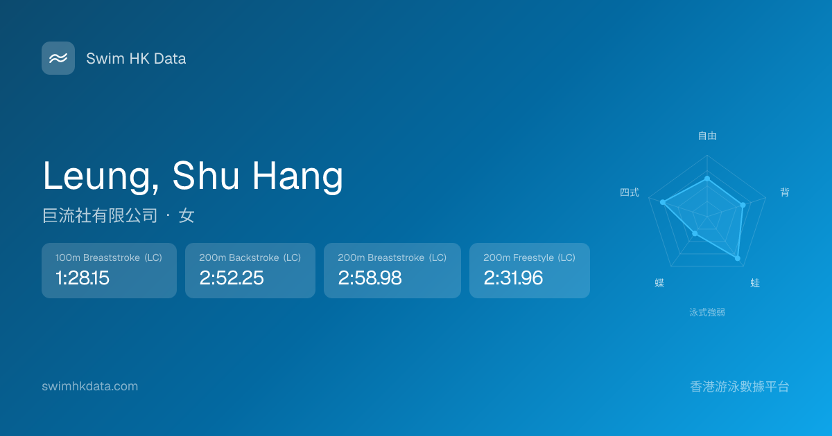 此圖表根據你所有比賽成績計算,顯示你在各泳式的相對強弱,僅供參考。繼續努力,每一次練習都會讓你更快更強!💪