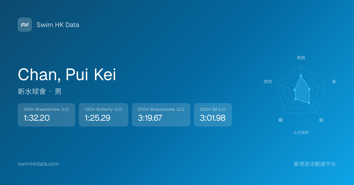 此圖表根據你所有比賽成績計算,顯示你在各泳式的相對強弱,僅供參考。繼續努力,每一次練習都會讓你更快更強!💪