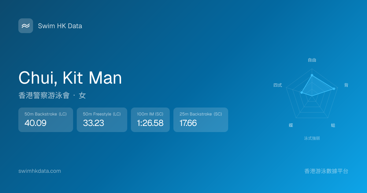 此圖表根據你所有比賽成績計算,顯示你在各泳式的相對強弱,僅供參考。繼續努力,每一次練習都會讓你更快更強!💪