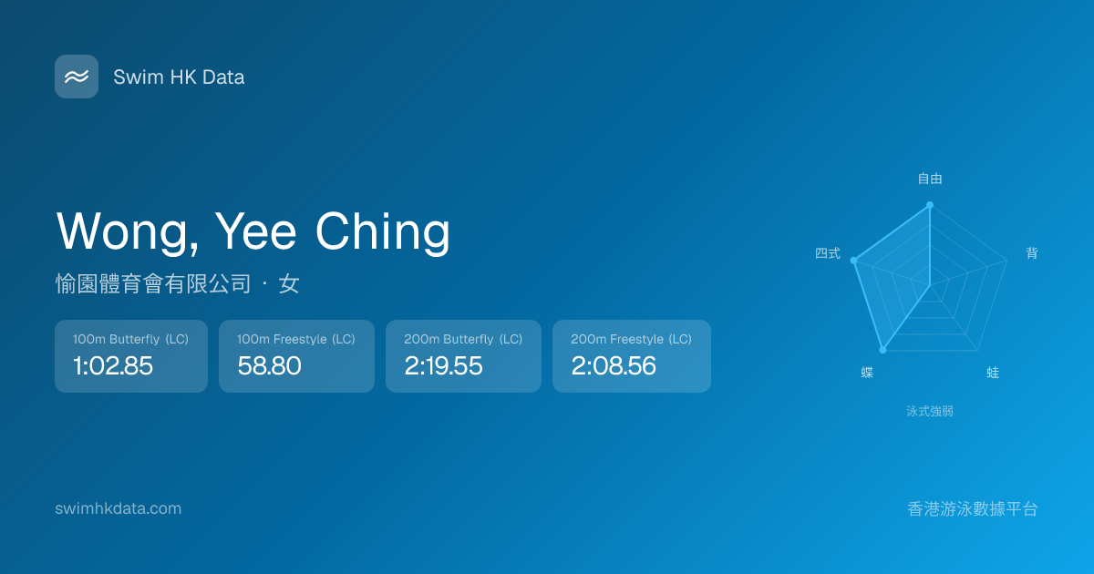 此圖表根據你所有比賽成績計算,顯示你在各泳式的相對強弱,僅供參考。繼續努力,每一次練習都會讓你更快更強!💪