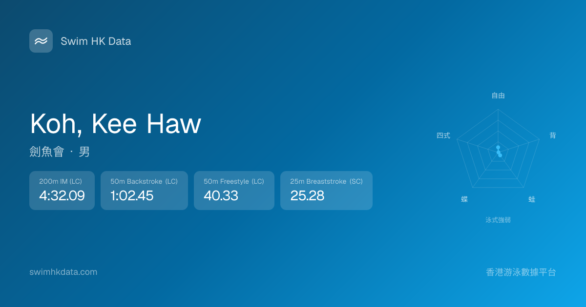 此圖表根據你所有比賽成績計算,顯示你在各泳式的相對強弱,僅供參考。繼續努力,每一次練習都會讓你更快更強!💪