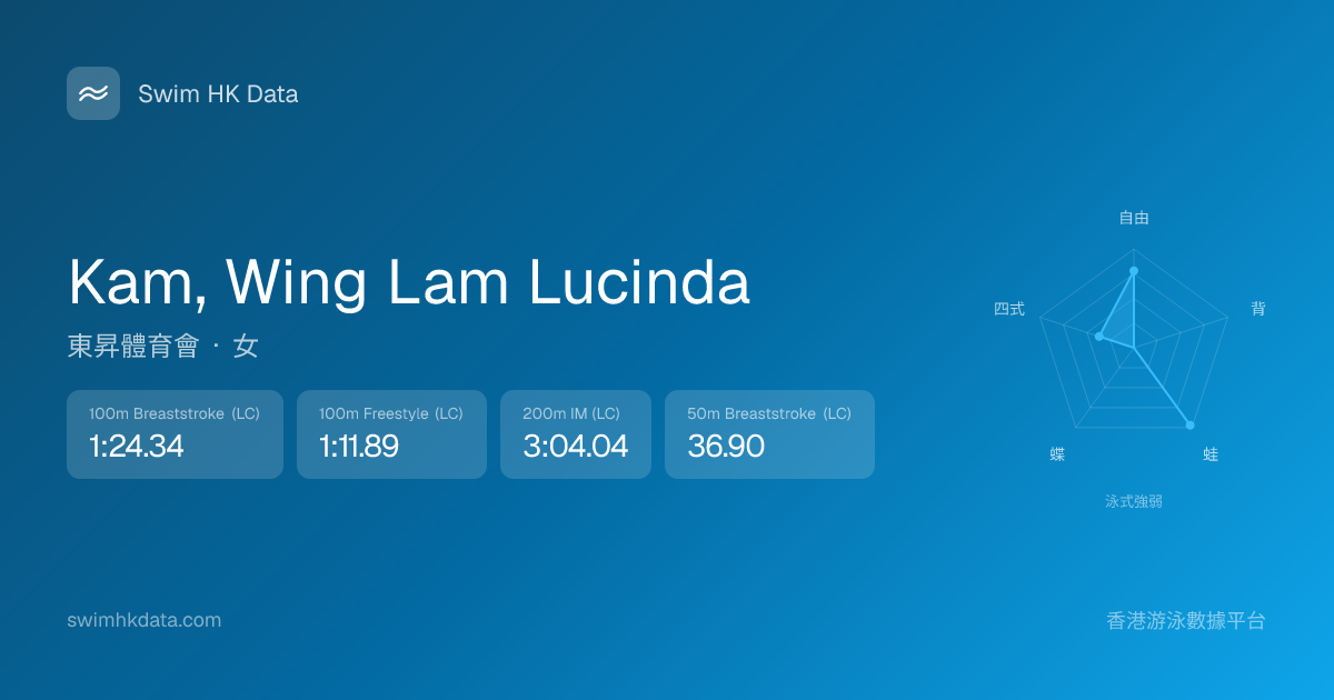 此圖表根據你所有比賽成績計算,顯示你在各泳式的相對強弱,僅供參考。繼續努力,每一次練習都會讓你更快更強!💪