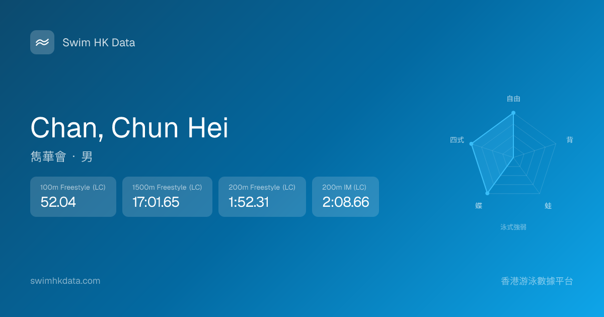 此圖表根據你所有比賽成績計算,顯示你在各泳式的相對強弱,僅供參考。繼續努力,每一次練習都會讓你更快更強!💪