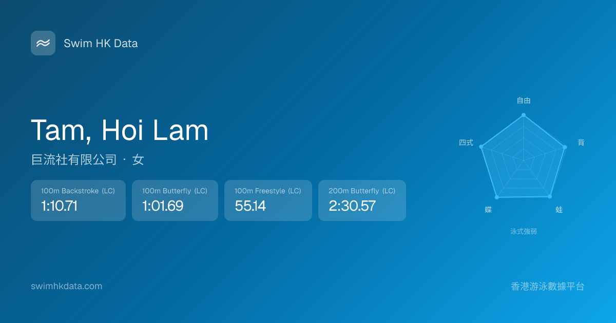 此圖表根據你所有比賽成績計算,顯示你在各泳式的相對強弱,僅供參考。繼續努力,每一次練習都會讓你更快更強!💪