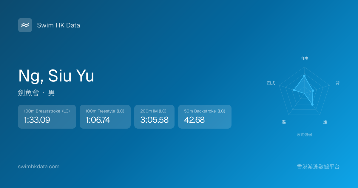 此圖表根據你所有比賽成績計算,顯示你在各泳式的相對強弱,僅供參考。繼續努力,每一次練習都會讓你更快更強!💪