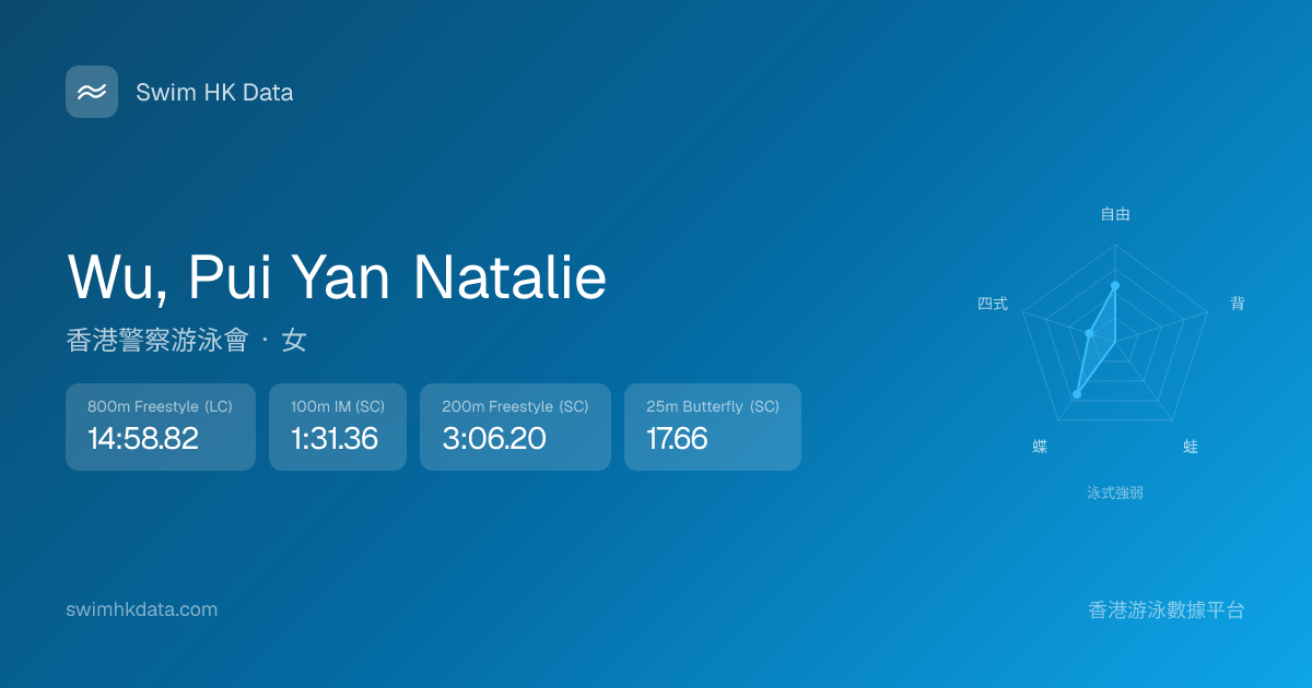 此圖表根據你所有比賽成績計算,顯示你在各泳式的相對強弱,僅供參考。繼續努力,每一次練習都會讓你更快更強!💪