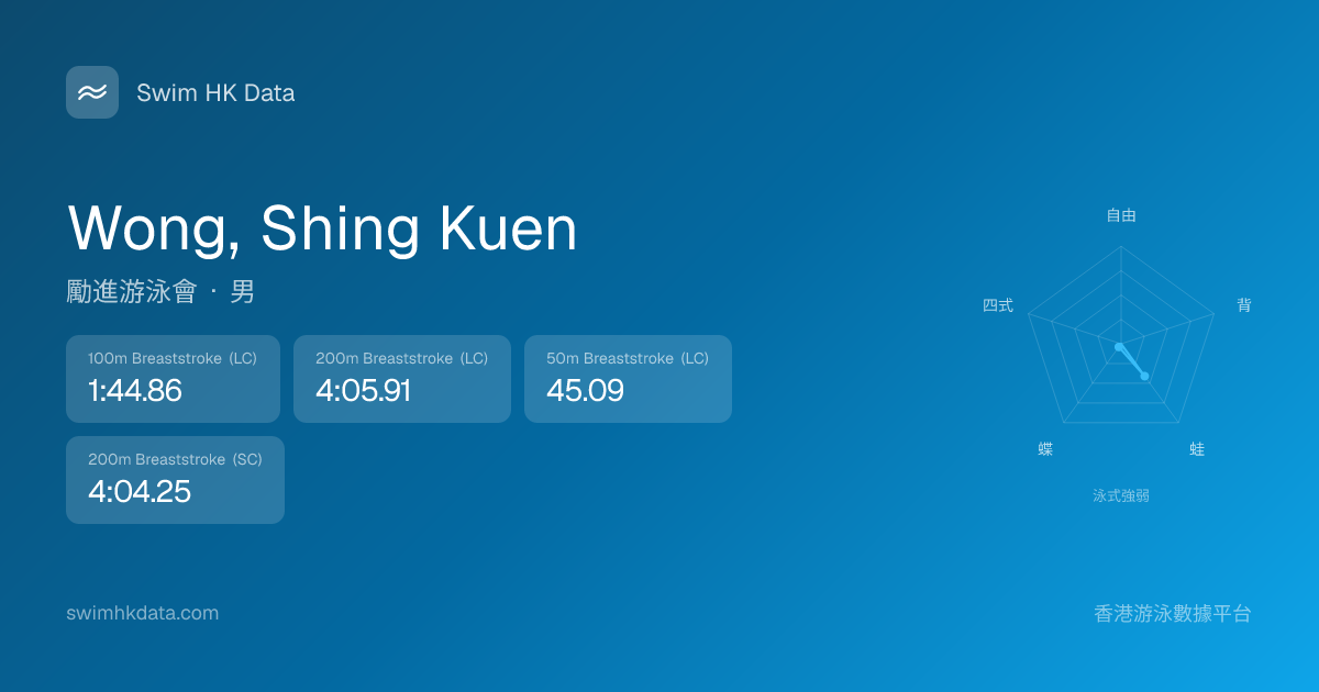 此圖表根據你所有比賽成績計算,顯示你在各泳式的相對強弱,僅供參考。繼續努力,每一次練習都會讓你更快更強!💪