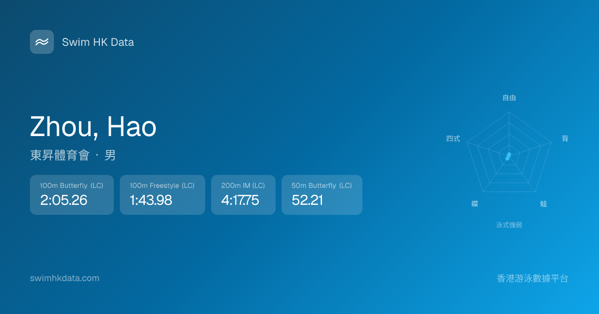 此圖表根據你所有比賽成績計算,顯示你在各泳式的相對強弱,僅供參考。繼續努力,每一次練習都會讓你更快更強!💪