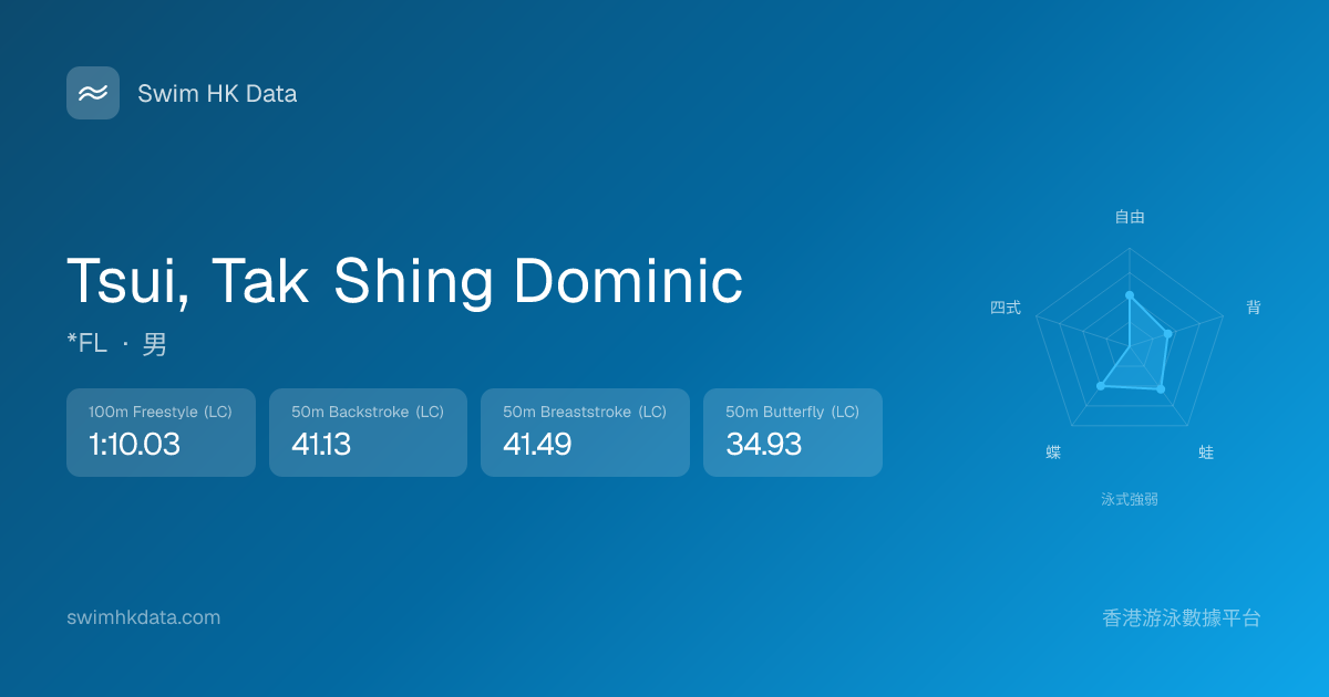 此圖表根據你所有比賽成績計算,顯示你在各泳式的相對強弱,僅供參考。繼續努力,每一次練習都會讓你更快更強!💪