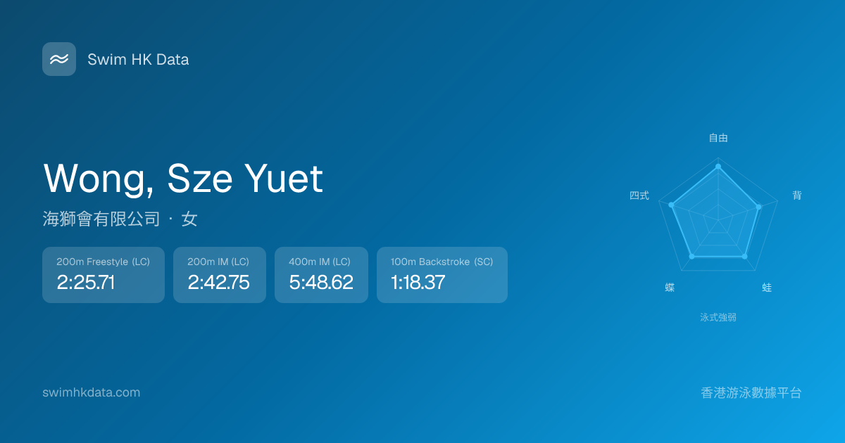 此圖表根據你所有比賽成績計算,顯示你在各泳式的相對強弱,僅供參考。繼續努力,每一次練習都會讓你更快更強!💪