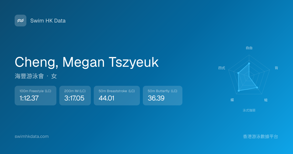 此圖表根據你所有比賽成績計算,顯示你在各泳式的相對強弱,僅供參考。繼續努力,每一次練習都會讓你更快更強!💪