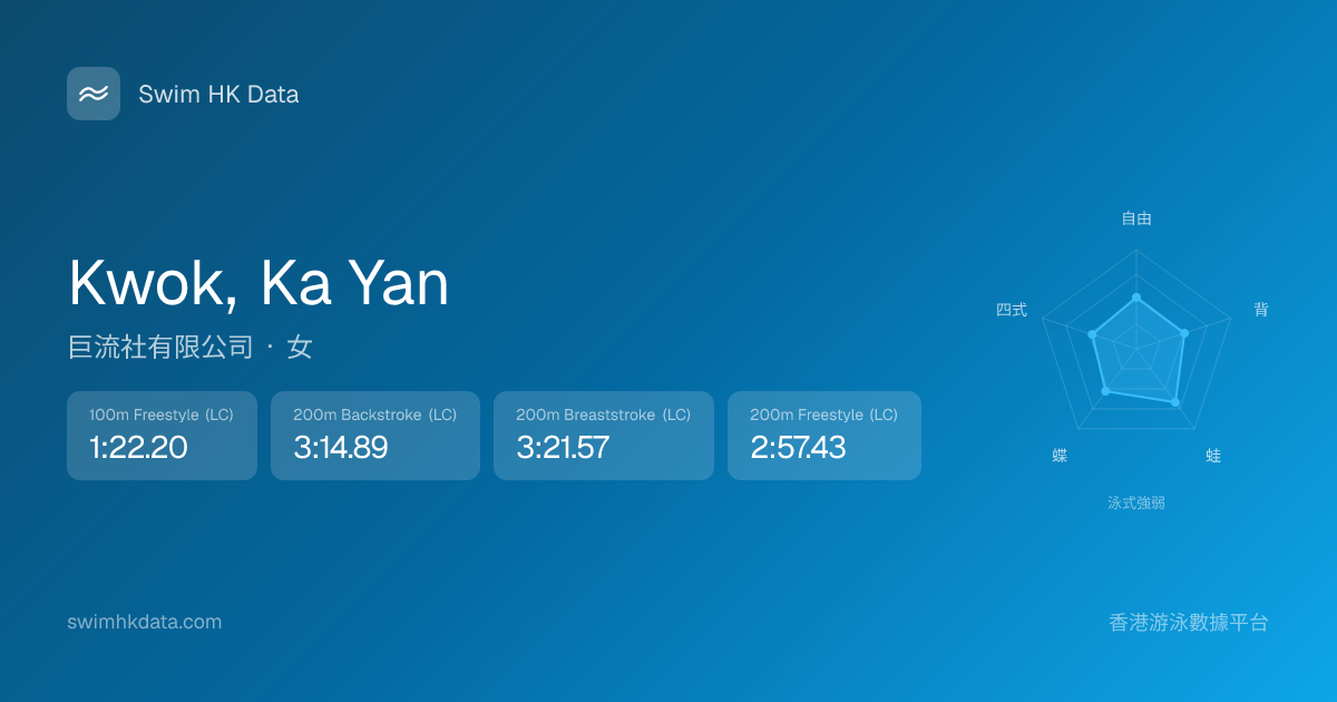 此圖表根據你所有比賽成績計算,顯示你在各泳式的相對強弱,僅供參考。繼續努力,每一次練習都會讓你更快更強!💪