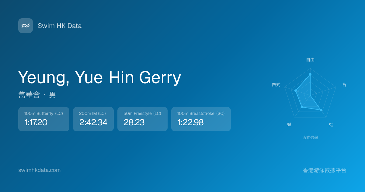 此圖表根據你所有比賽成績計算,顯示你在各泳式的相對強弱,僅供參考。繼續努力,每一次練習都會讓你更快更強!💪
