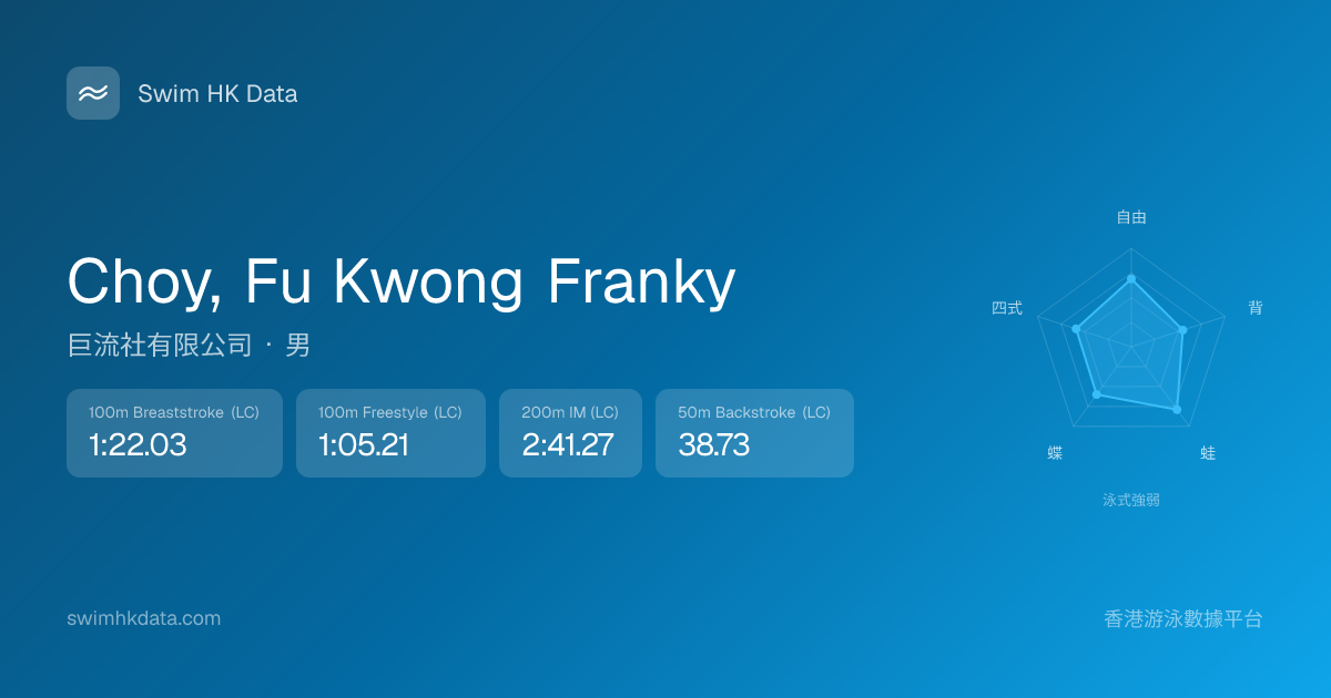 此圖表根據你所有比賽成績計算,顯示你在各泳式的相對強弱,僅供參考。繼續努力,每一次練習都會讓你更快更強!💪