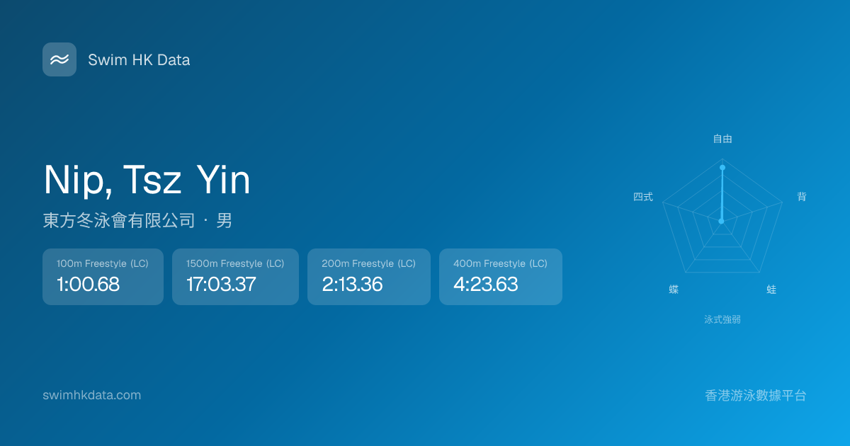 此圖表根據你所有比賽成績計算,顯示你在各泳式的相對強弱,僅供參考。繼續努力,每一次練習都會讓你更快更強!💪