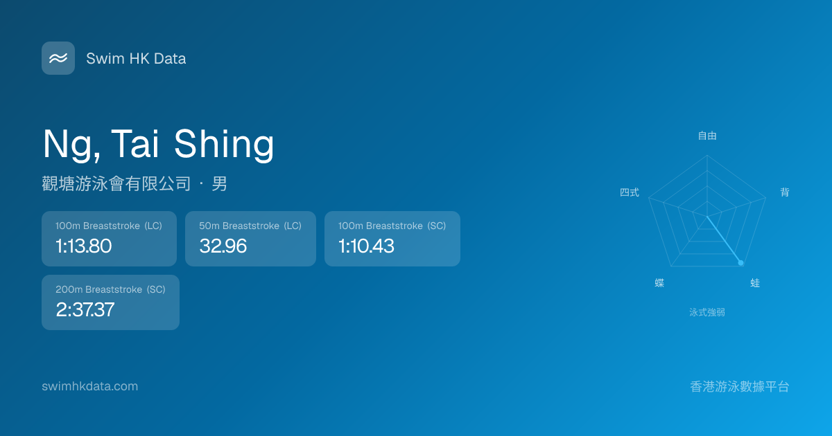 此圖表根據你所有比賽成績計算,顯示你在各泳式的相對強弱,僅供參考。繼續努力,每一次練習都會讓你更快更強!💪