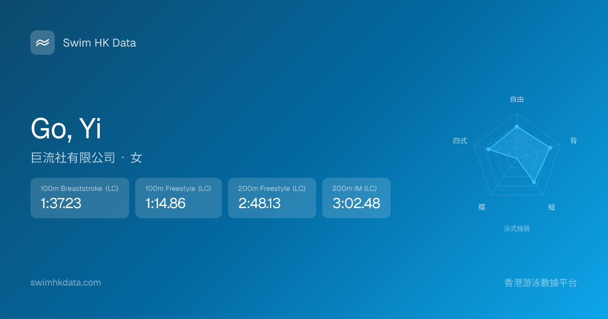 此圖表根據你所有比賽成績計算,顯示你在各泳式的相對強弱,僅供參考。繼續努力,每一次練習都會讓你更快更強!💪