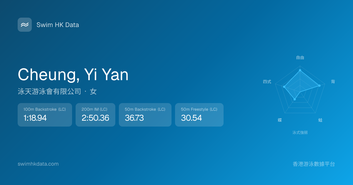 此圖表根據你所有比賽成績計算,顯示你在各泳式的相對強弱,僅供參考。繼續努力,每一次練習都會讓你更快更強!💪