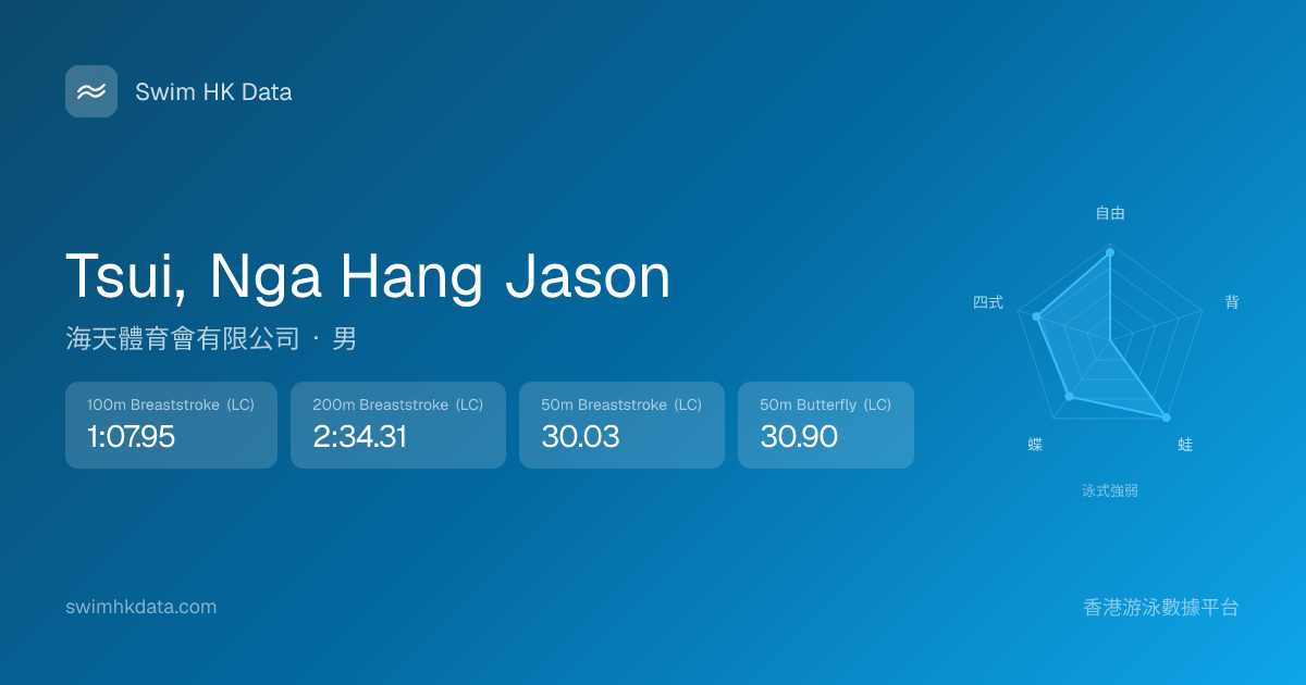 此圖表根據你所有比賽成績計算,顯示你在各泳式的相對強弱,僅供參考。繼續努力,每一次練習都會讓你更快更強!💪