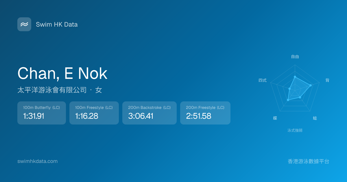 此圖表根據你所有比賽成績計算,顯示你在各泳式的相對強弱,僅供參考。繼續努力,每一次練習都會讓你更快更強!💪
