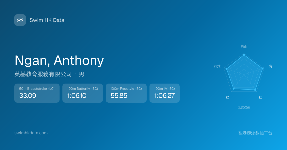 此圖表根據你所有比賽成績計算,顯示你在各泳式的相對強弱,僅供參考。繼續努力,每一次練習都會讓你更快更強!💪