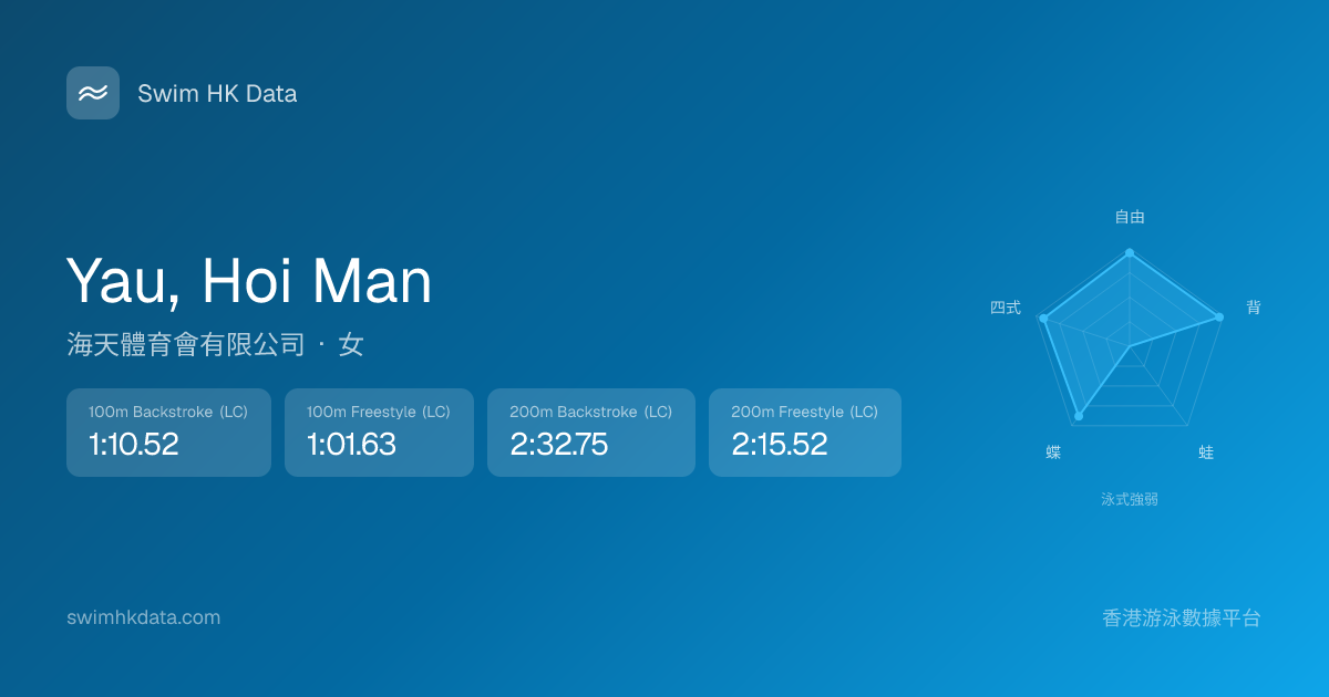 此圖表根據你所有比賽成績計算,顯示你在各泳式的相對強弱,僅供參考。繼續努力,每一次練習都會讓你更快更強!💪
