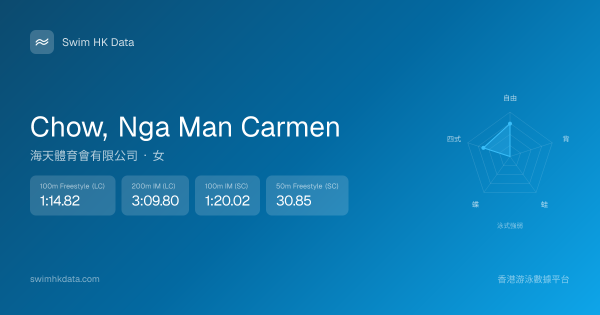 此圖表根據你所有比賽成績計算,顯示你在各泳式的相對強弱,僅供參考。繼續努力,每一次練習都會讓你更快更強!💪