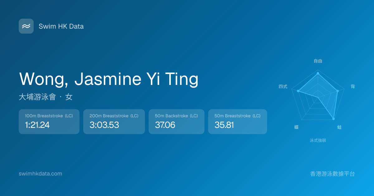 此圖表根據你所有比賽成績計算,顯示你在各泳式的相對強弱,僅供參考。繼續努力,每一次練習都會讓你更快更強!💪