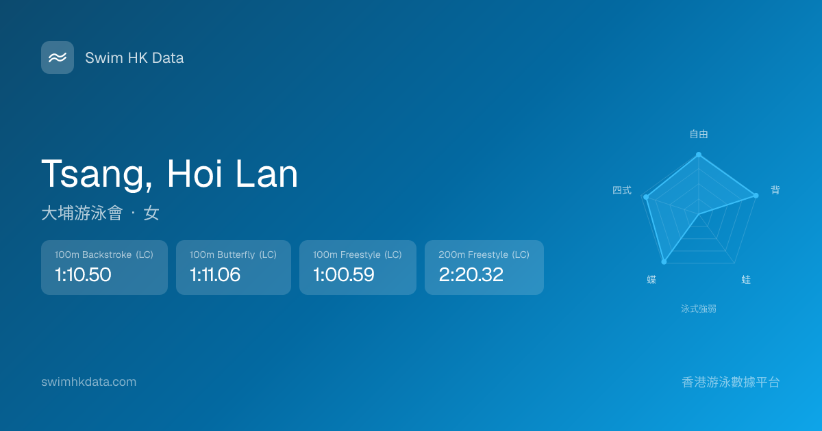 此圖表根據你所有比賽成績計算,顯示你在各泳式的相對強弱,僅供參考。繼續努力,每一次練習都會讓你更快更強!💪