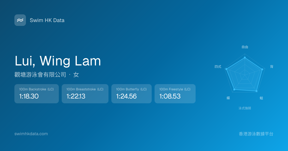 此圖表根據你所有比賽成績計算,顯示你在各泳式的相對強弱,僅供參考。繼續努力,每一次練習都會讓你更快更強!💪