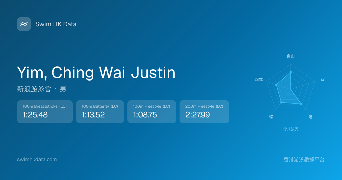 此圖表根據你所有比賽成績計算,顯示你在各泳式的相對強弱,僅供參考。繼續努力,每一次練習都會讓你更快更強!💪