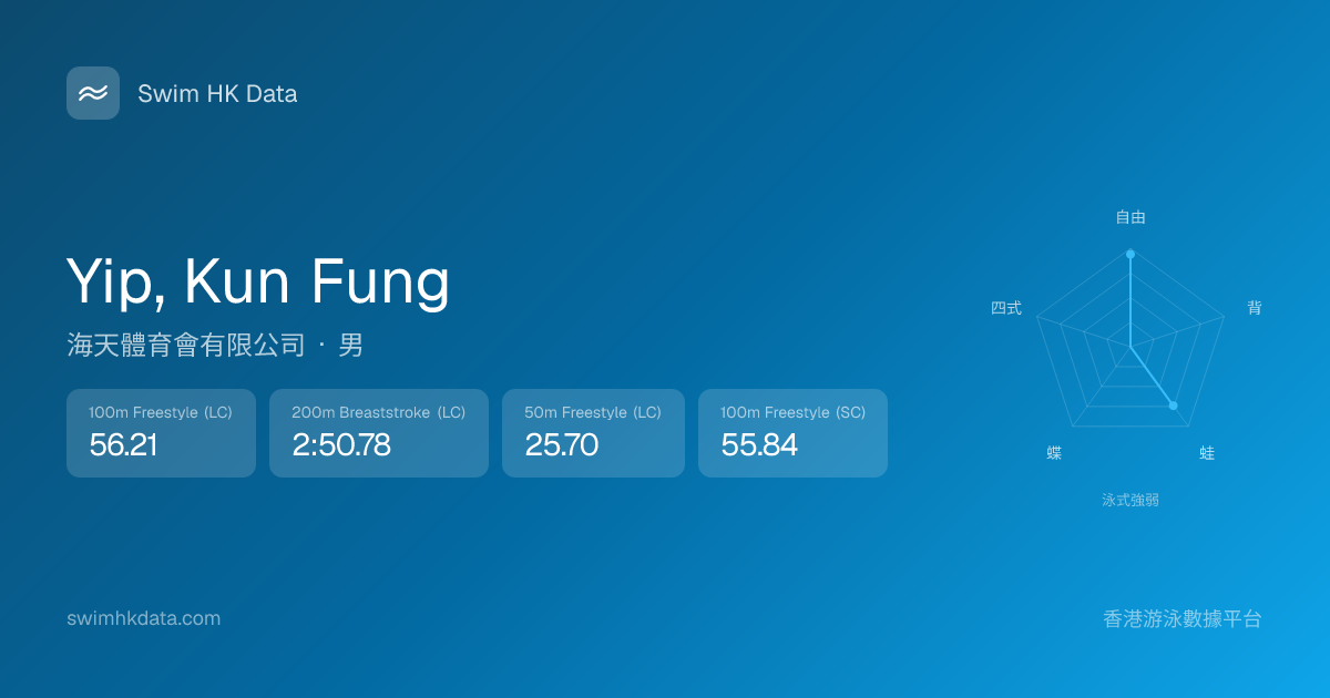 此圖表根據你所有比賽成績計算,顯示你在各泳式的相對強弱,僅供參考。繼續努力,每一次練習都會讓你更快更強!💪