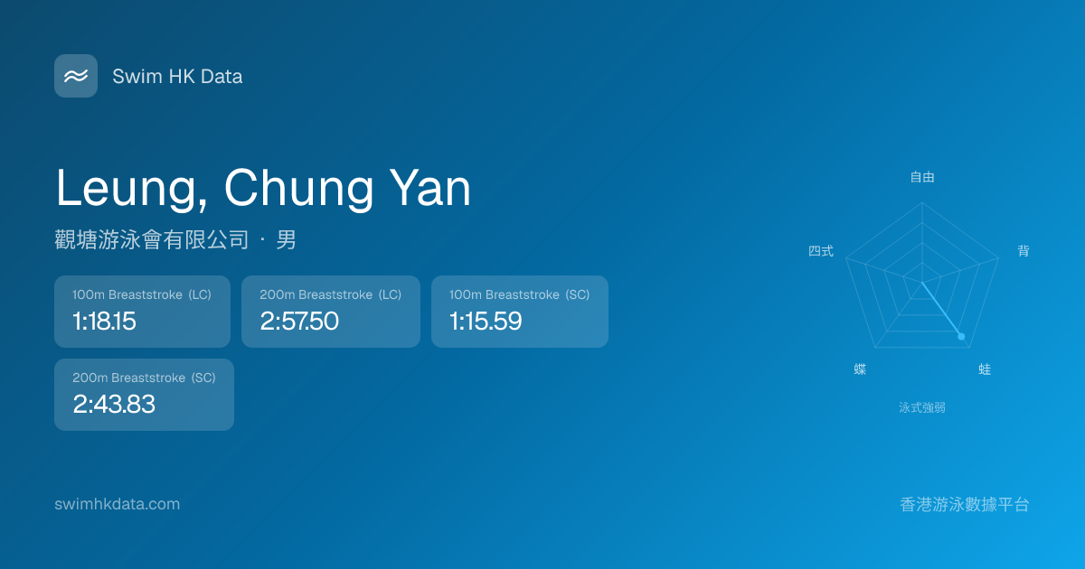 此圖表根據你所有比賽成績計算,顯示你在各泳式的相對強弱,僅供參考。繼續努力,每一次練習都會讓你更快更強!💪