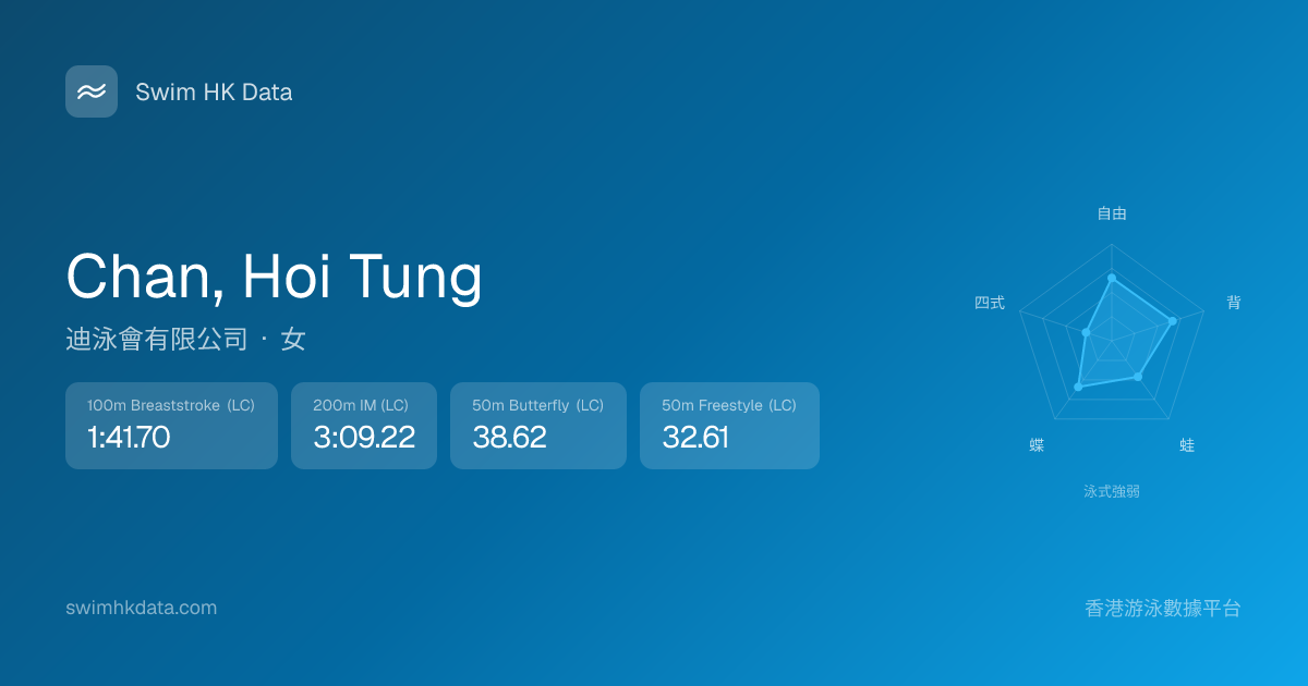 此圖表根據你所有比賽成績計算,顯示你在各泳式的相對強弱,僅供參考。繼續努力,每一次練習都會讓你更快更強!💪